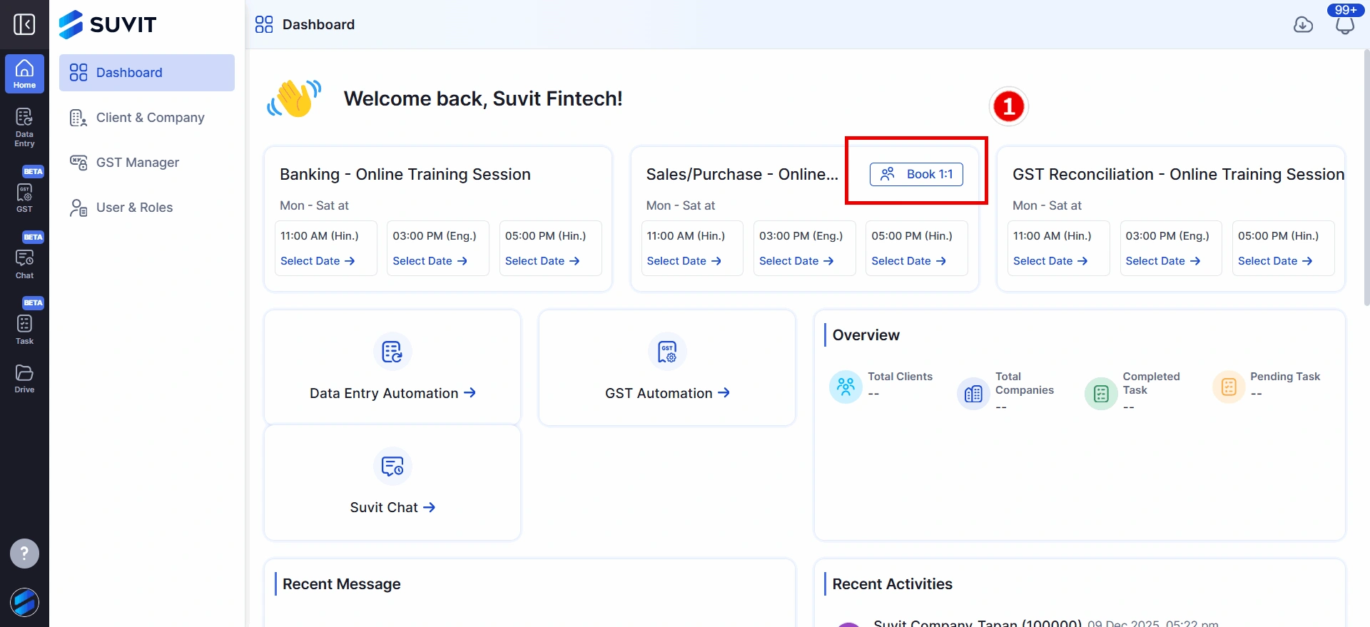 You can book a 1:1 training session only for the Sales/Purchase module directly from your Suvit dashboard.