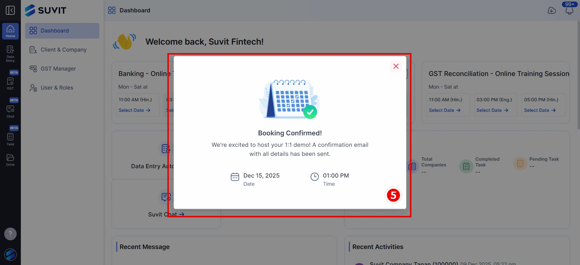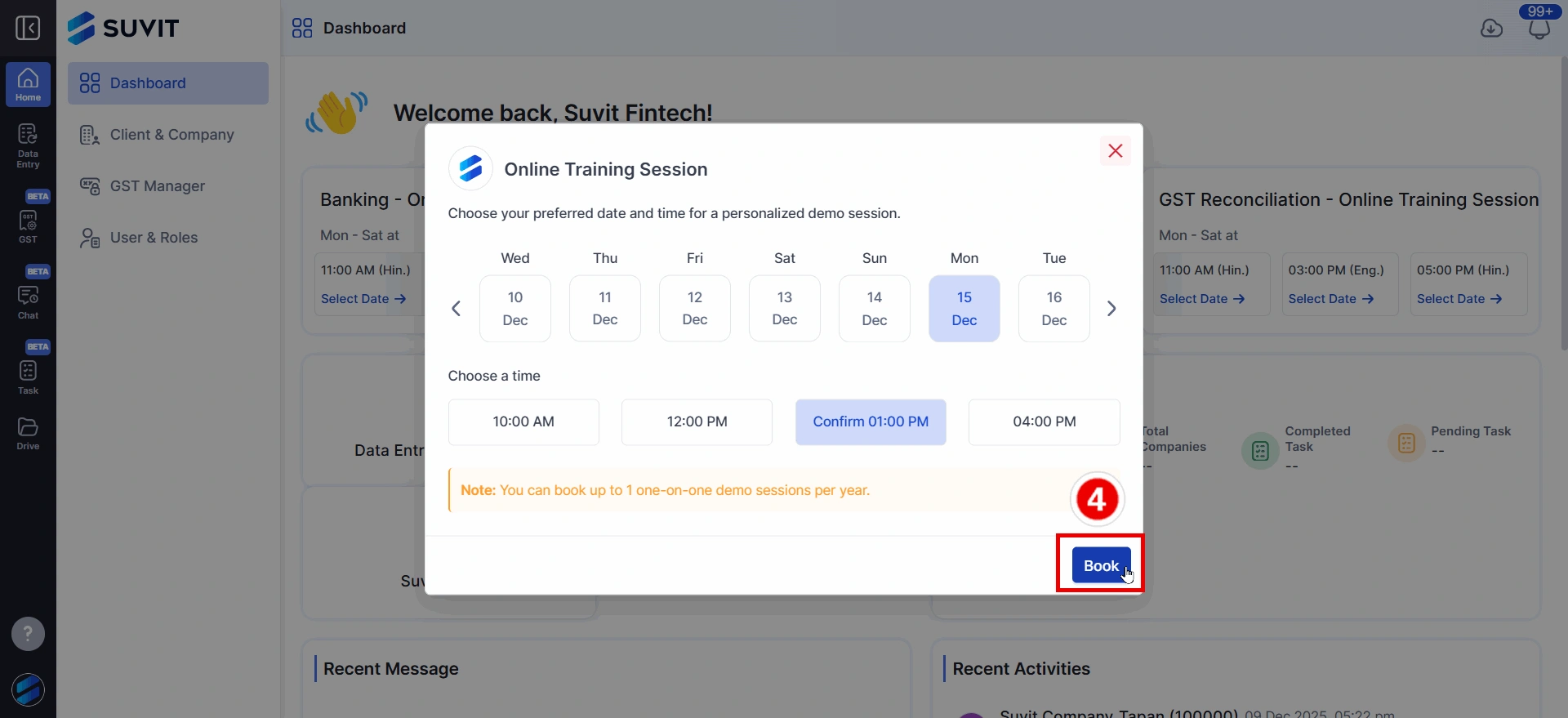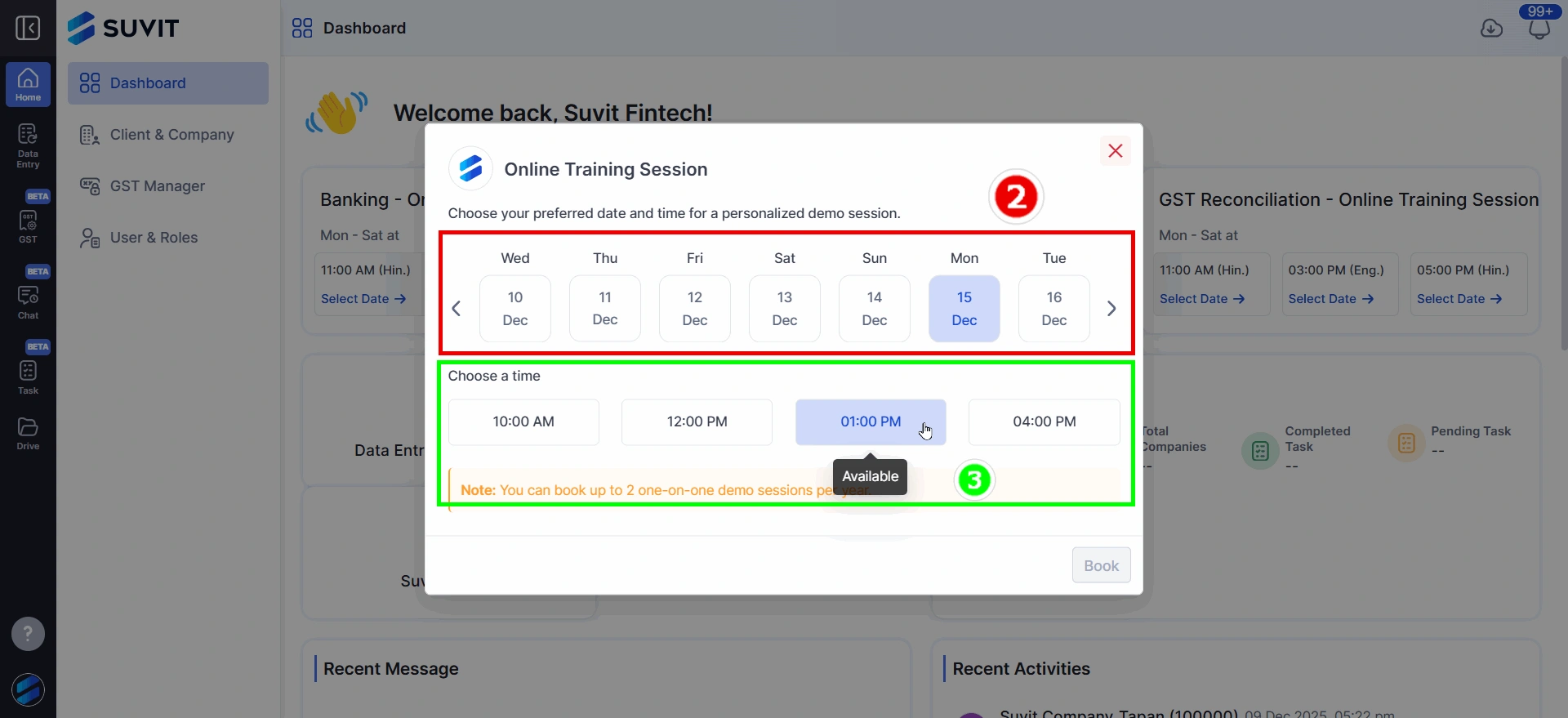 Learn how to easily book Suvit training sessions from your dashboard. Select module, choose date & time, fill details, and get confirmation.